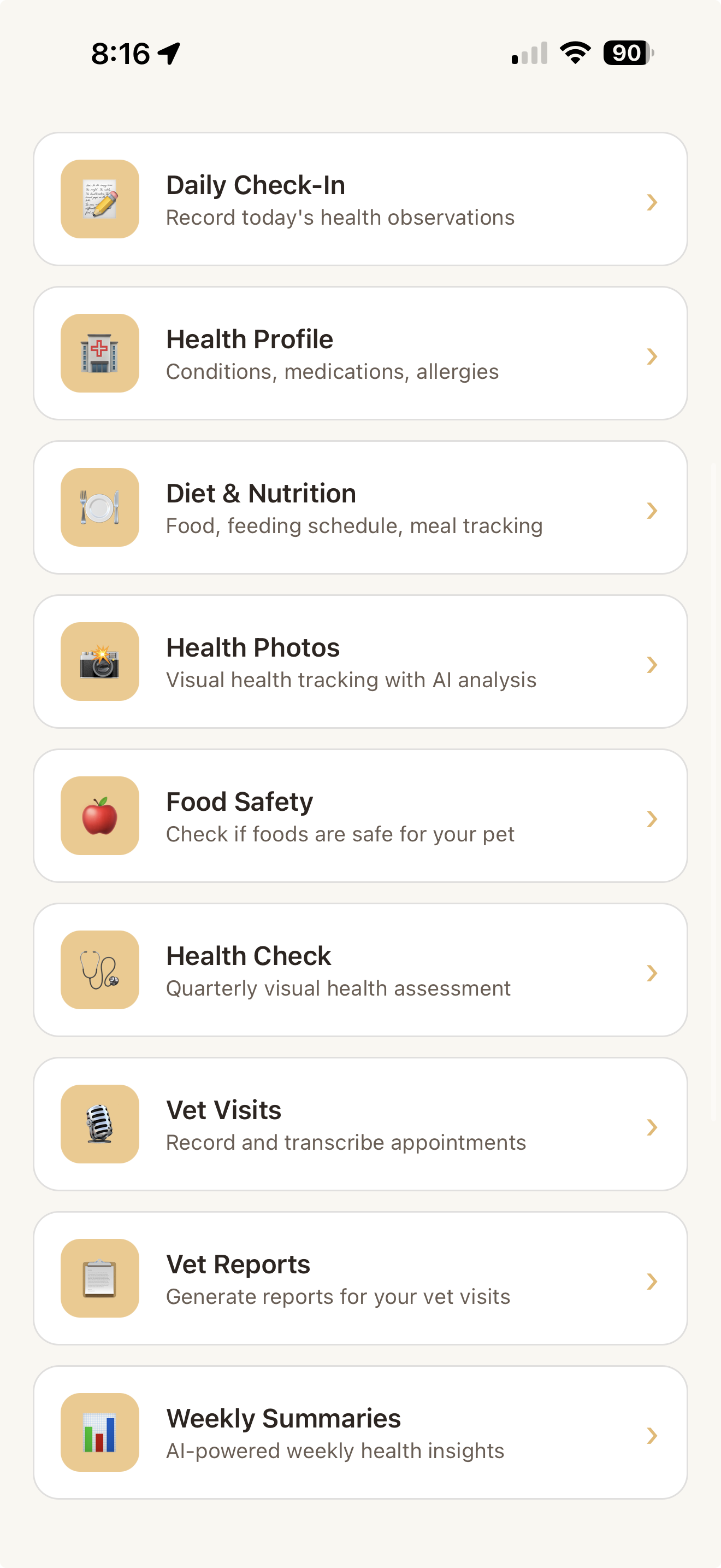 - Daily check-ins — 30 seconds to capture how your pet is doing
